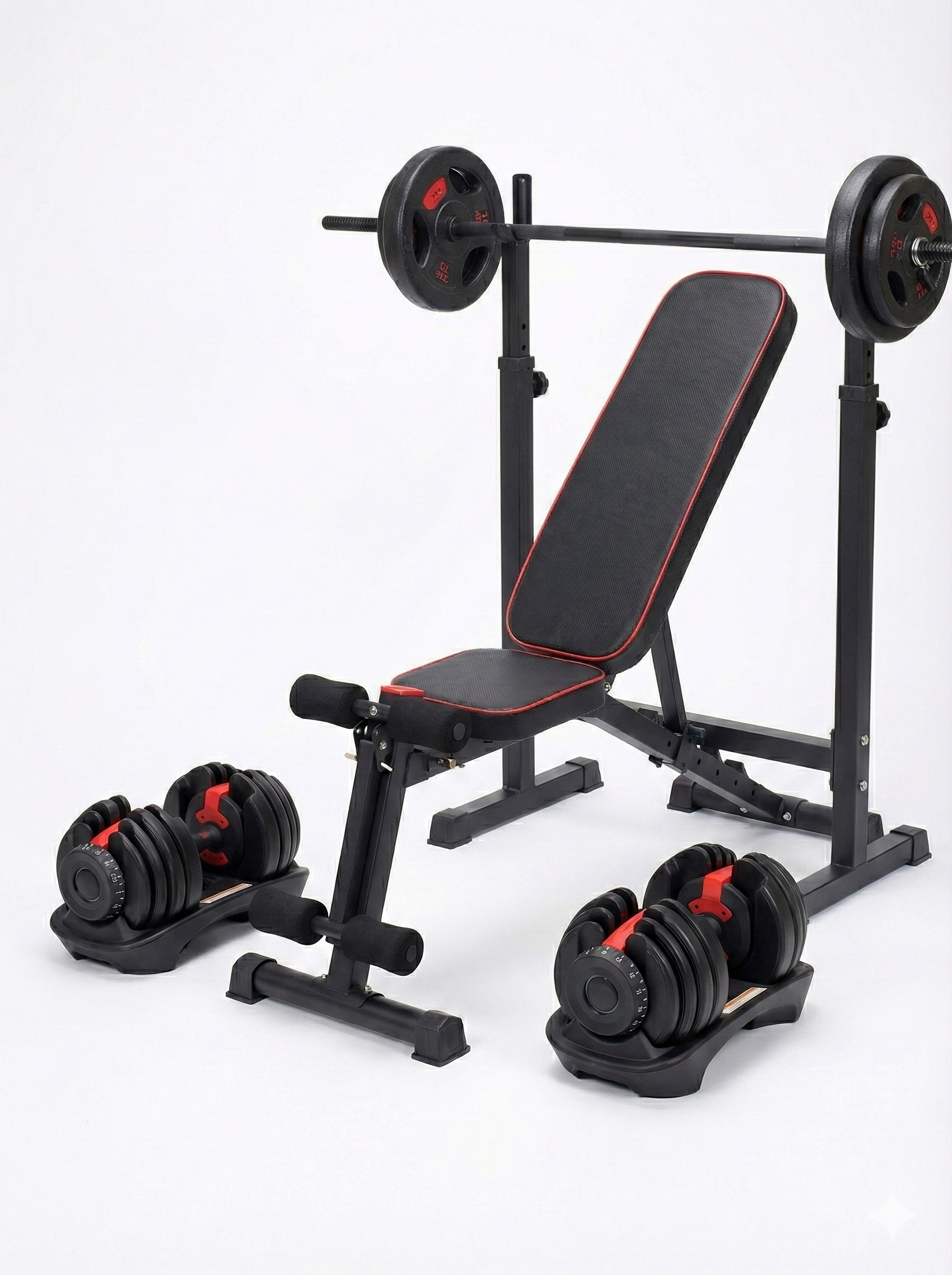 Barbell Set with Stands: High-quality barbell and weight set with stable, adjustable stands. Ideal for squats, bench presses, and deadlifts.